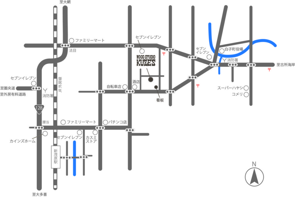 首都高速7号線または首都高速湾岸線から京葉道路→千葉東金道路→圏央道茂原北IC下車より約15分