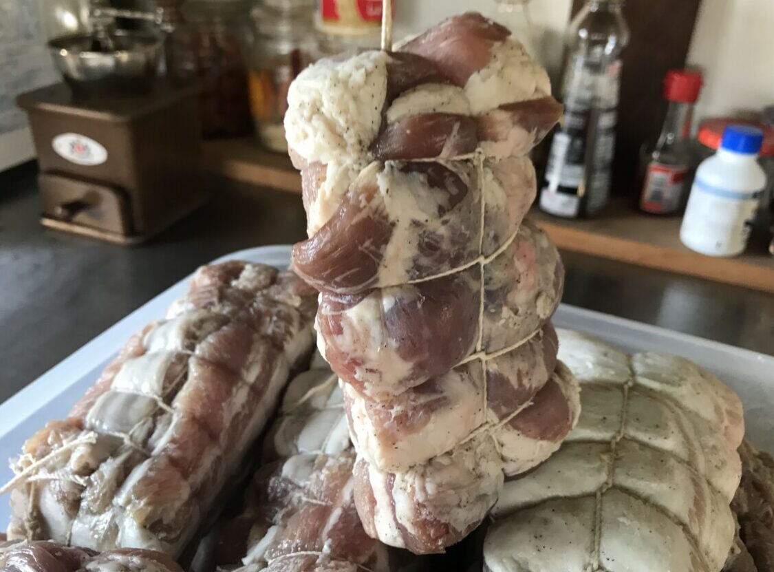 10日間熟成させた豚肉をスーモークするための下準備をしていきます。