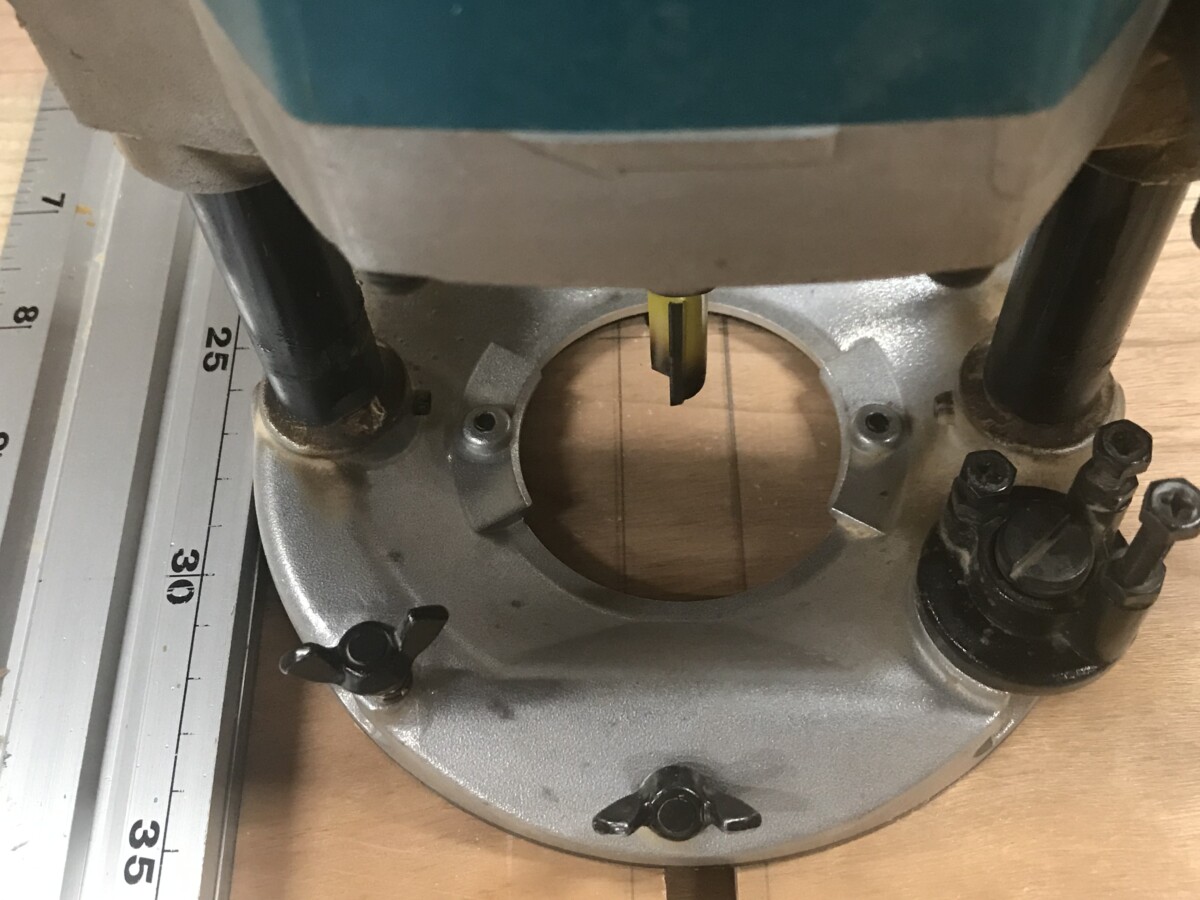 12ミリのプランジストレートビットで17ミリの深さでまで掘っています。予め17ミリで止まるようにセットしておきます。堅いチェリーの木なのでプランジ刃とはい一気に掘るのは危険です。浅く往復しながら少しずつ刃を入れながら掘っていきます。