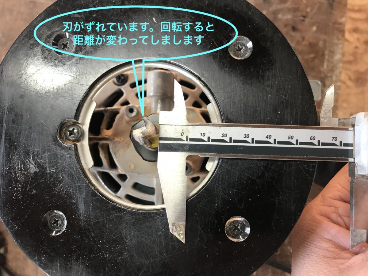ルーターのベースの端を定規に滑らせながら加工します。ベースの端から刃の端までの距離が定規をセットする距離になります。その距離はデジタルノギスやケガキゲージで測ります。測るときに、刃が一番外側になるようにして測ります。刃が付いているところが一番出っ張っておるので、それ以外のところで測ると回転したときに距離が変わってしまします。