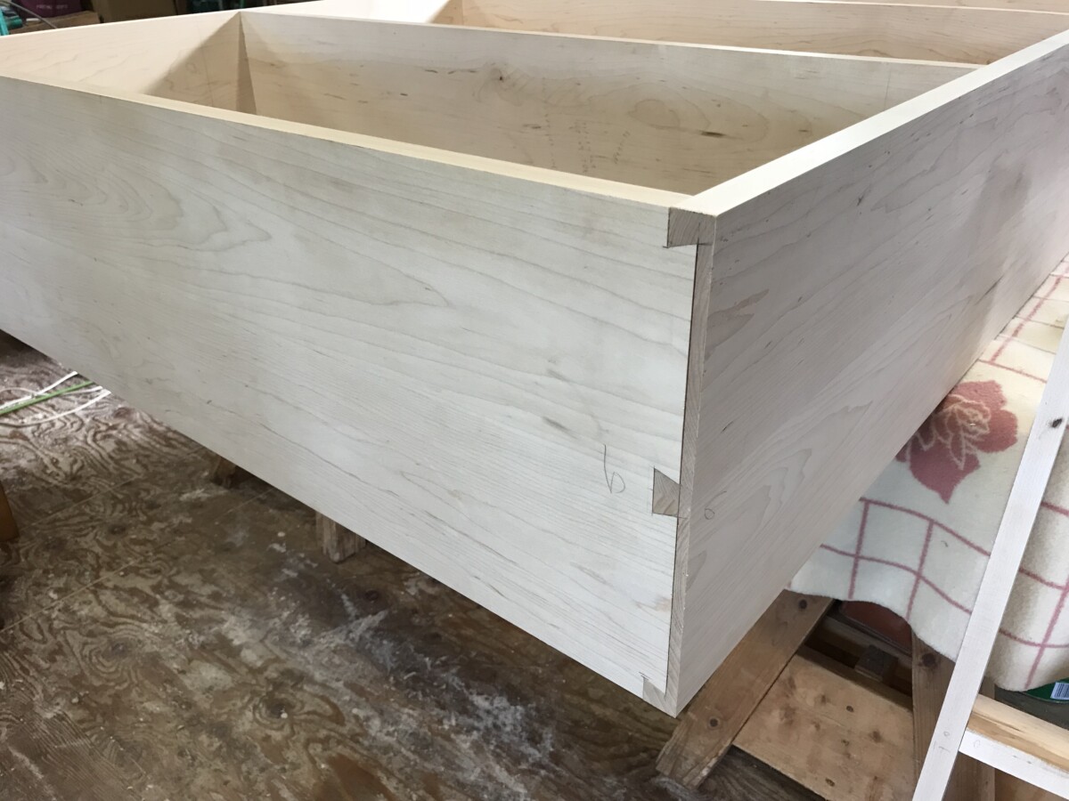 包み組継は一般に引き出しの前板と側板を接合するときによく用いられる方法です。一般的な通し蟻組継の場合、組手が剥き出しなのでしっかり組んでるぞというアピールになります。側板と天板の接合などしっかり見せたいときには効果的な方法ですが、引き出しの前板で使うとこれ見よがしで諄くなってしまいます。包み蟻は板の厚みの中に蟻のメスを埋め込む方法なので、しっかり組手で作りたいけどスマートに見せたいという時にとても有効な方法です。