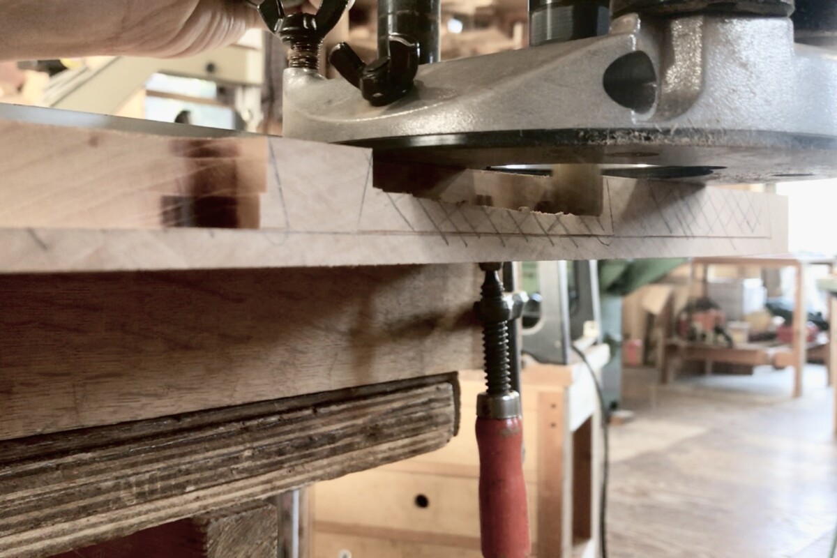 プランジルーターと鎬鑿(しのぎのみ)を使い包み蟻組継の加工をします