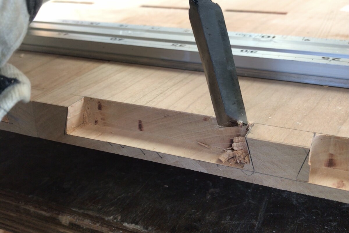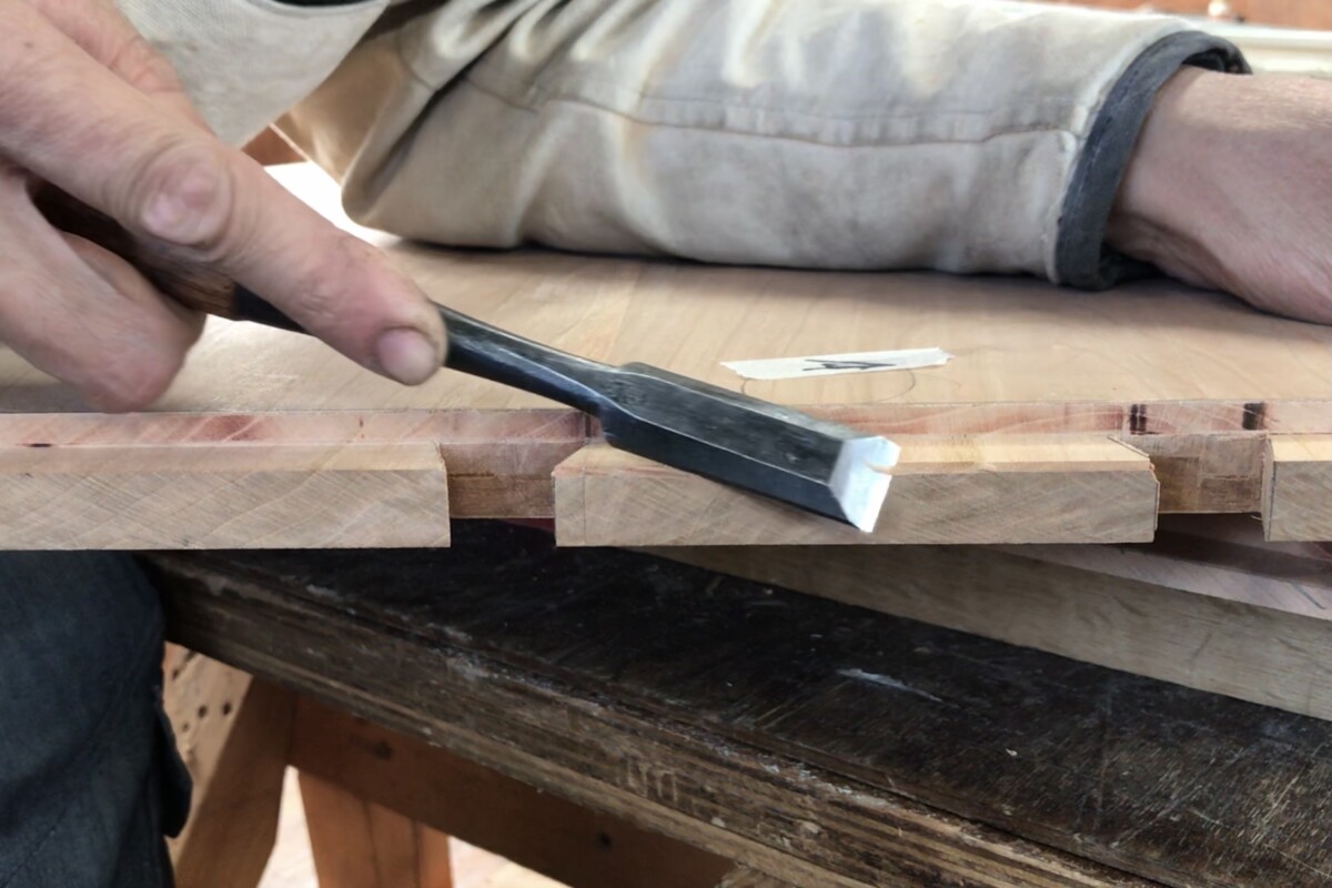 全て手工具で加工することも可能ですが、プランジルーターを使えは加工が早くて綺麗に仕上がります。機械で加工できない部分もありますので、その部分は鎬鑿を使い手加工します。