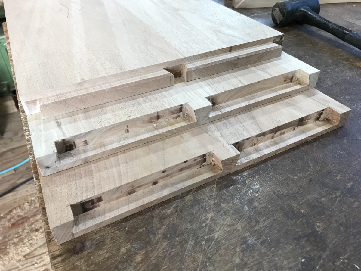 板組で棚など大きなものを作る場合、天板も底板も通し蟻組継で作るのも良いのですが、大きいものの場合見た目が諄くなってしまします。それと組み立ても上下同時に行わなくてはいけないので組み立て作業が困難になります。包み蟻組継を使えば差し込みの方向的に、本体を組んでからも後から差し込むことができます。