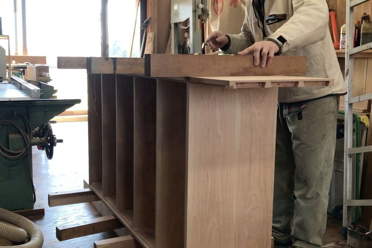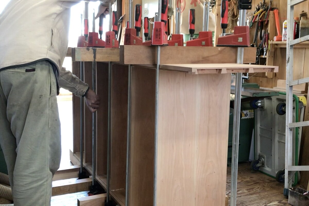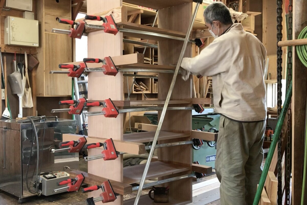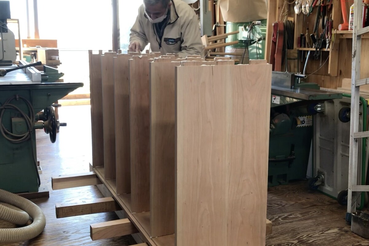 ホゾや蟻などの仕口を加工した収納棚の部材をひとつひとつ組み上げていきます。