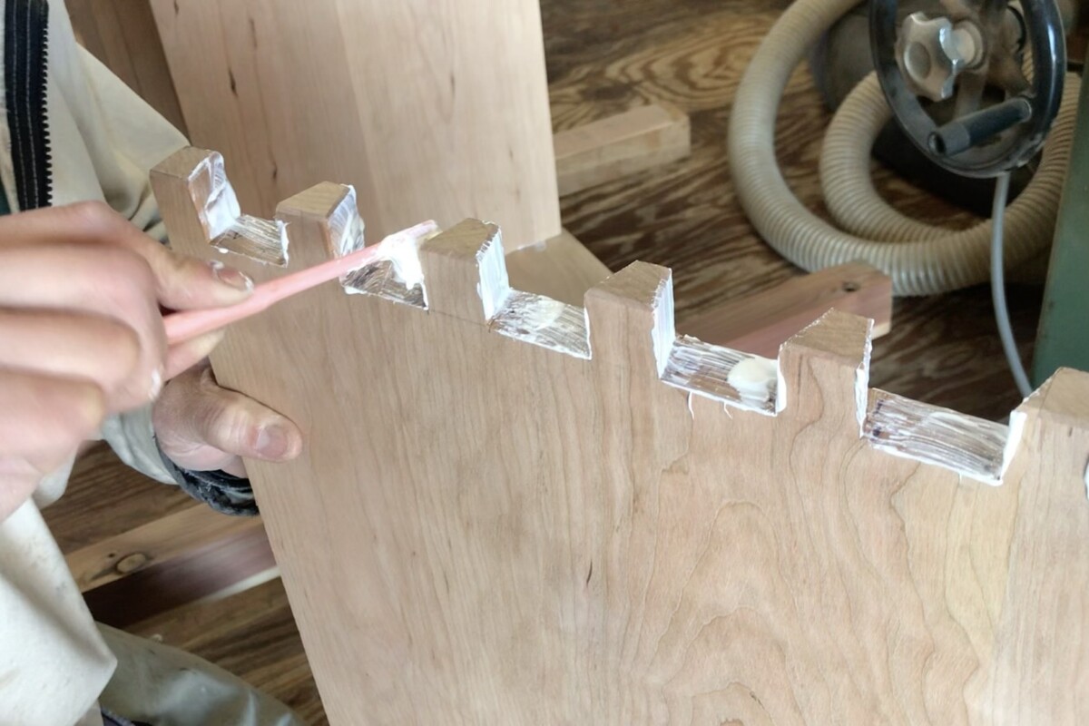 ホゾ組て使うボンドはコニシの木工ボンドCH18を使っています。粘性や効果時間などがちょうど良く調整してあり、とても扱いやすいボンドだと思います。季節にもよりますが、夏場だと30〜40分くらい、冬場だと40〜50分くらいで硬化し始めます。樹種によっても固まる条件は変わるので、その場の具合を見ながら作業をします。