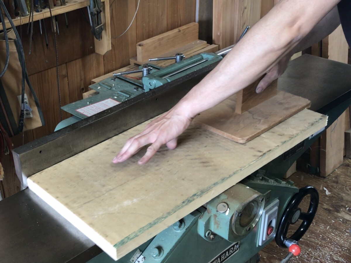 材木屋から購入し材木はラフ材と言って粗く板に挽いた状態の木材です。この材料をカンナをかけてムラをおとしていきます。この作業は板の反りをなるべく無くすため、ゆっくりシーズニング(環境に馴染ます)しながら加工を進めます。