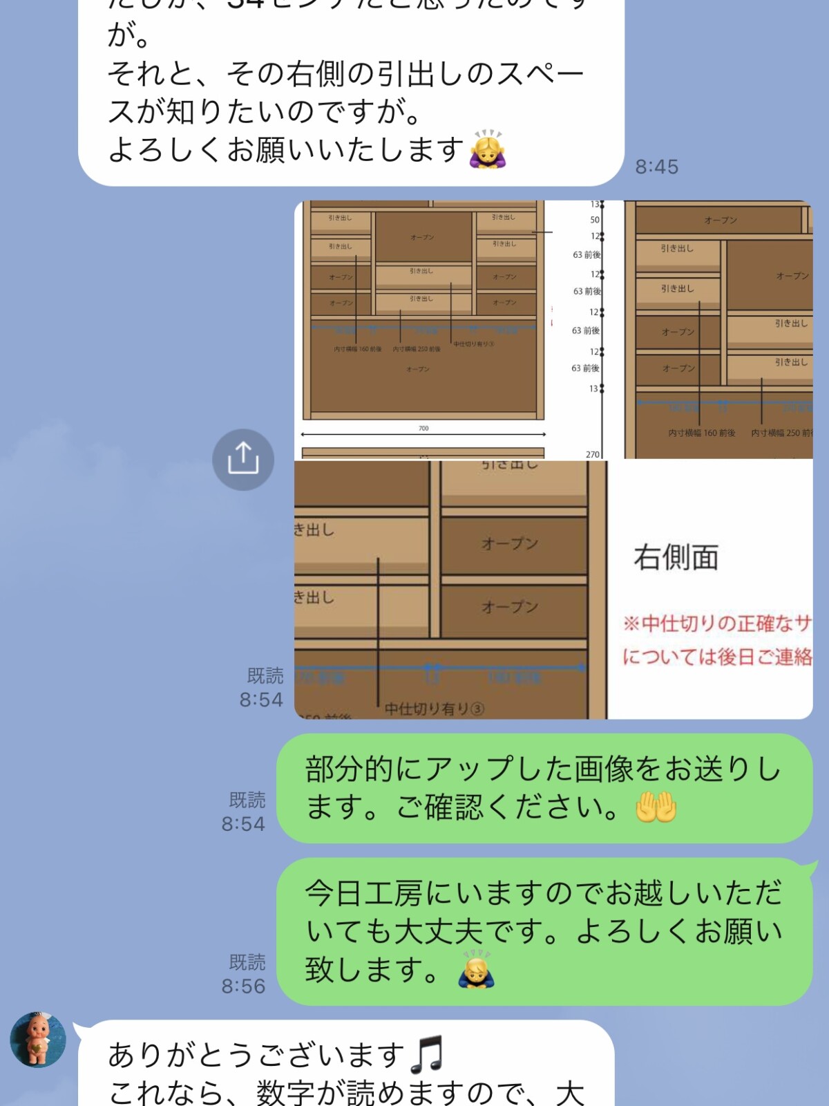 お客様とじっくり打ち合わせをしてデザインや方向性が固めていきます。メールやLINEなどで打ち合わせをします。実際に工房にお越しいただきお話しして決めることも多いです。最近は簡単にスマホでメールに写真やファイルを入れることができるので、ショートメールやLINEのやりとりが多くなりました。