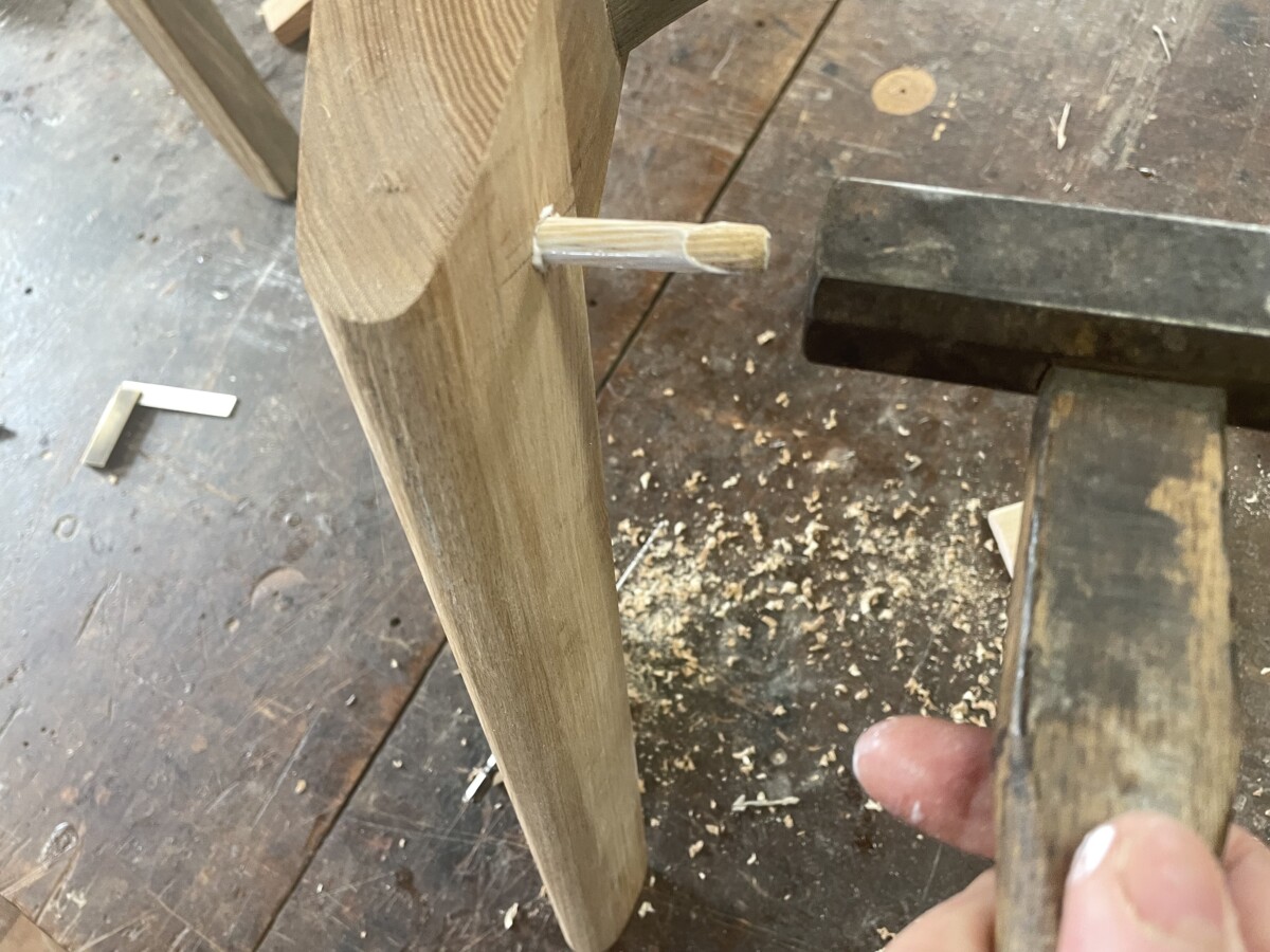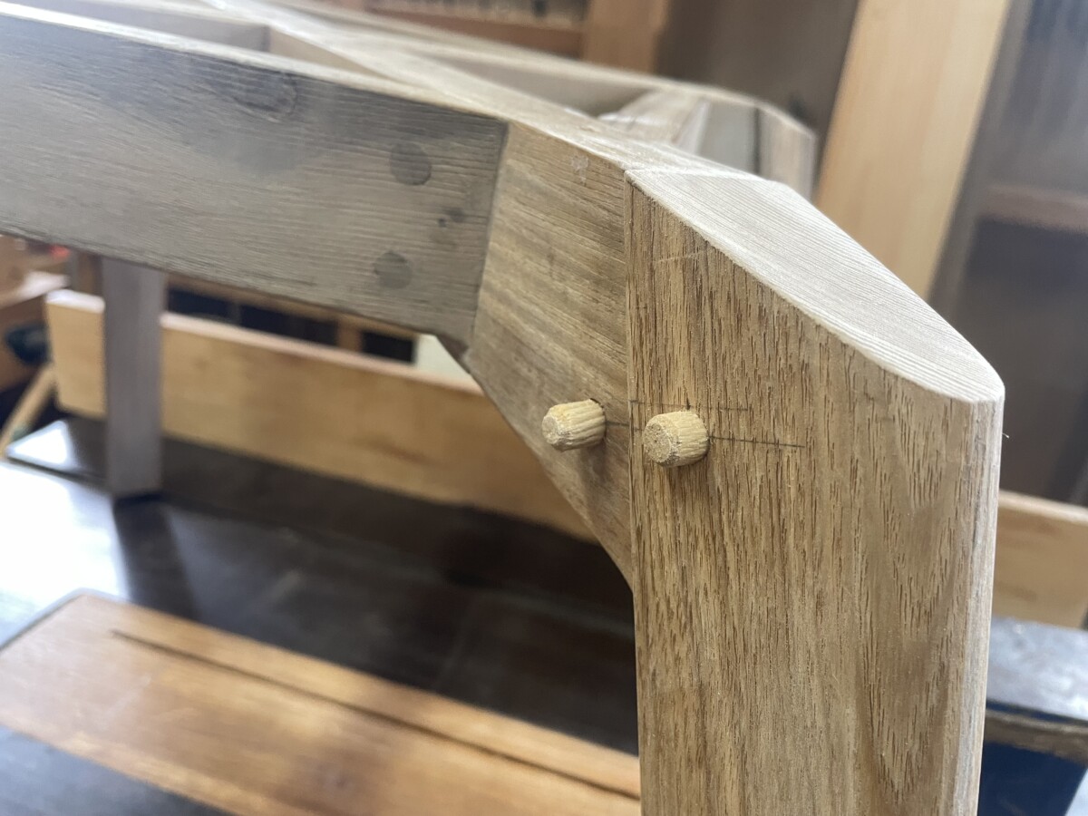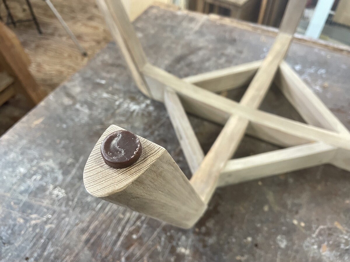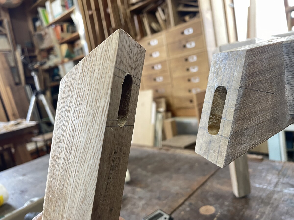本体と脚は枘(ホゾ)どうしで繋ぎ、そこに接着剤を入れて接着します。