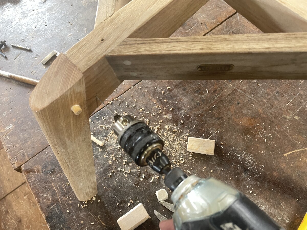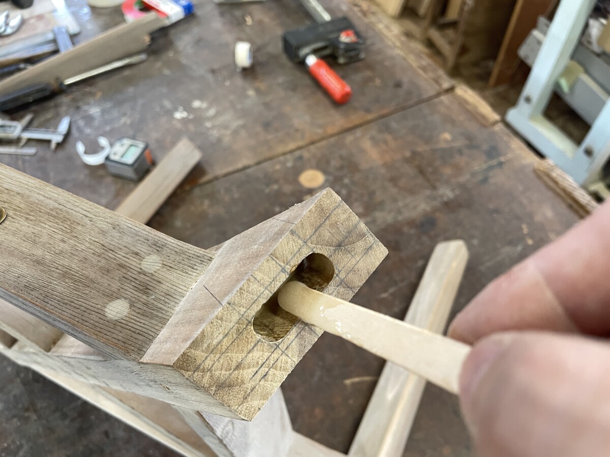 今回本体側もホゾが入っているので、こちら側も抜け止めを入れます。
