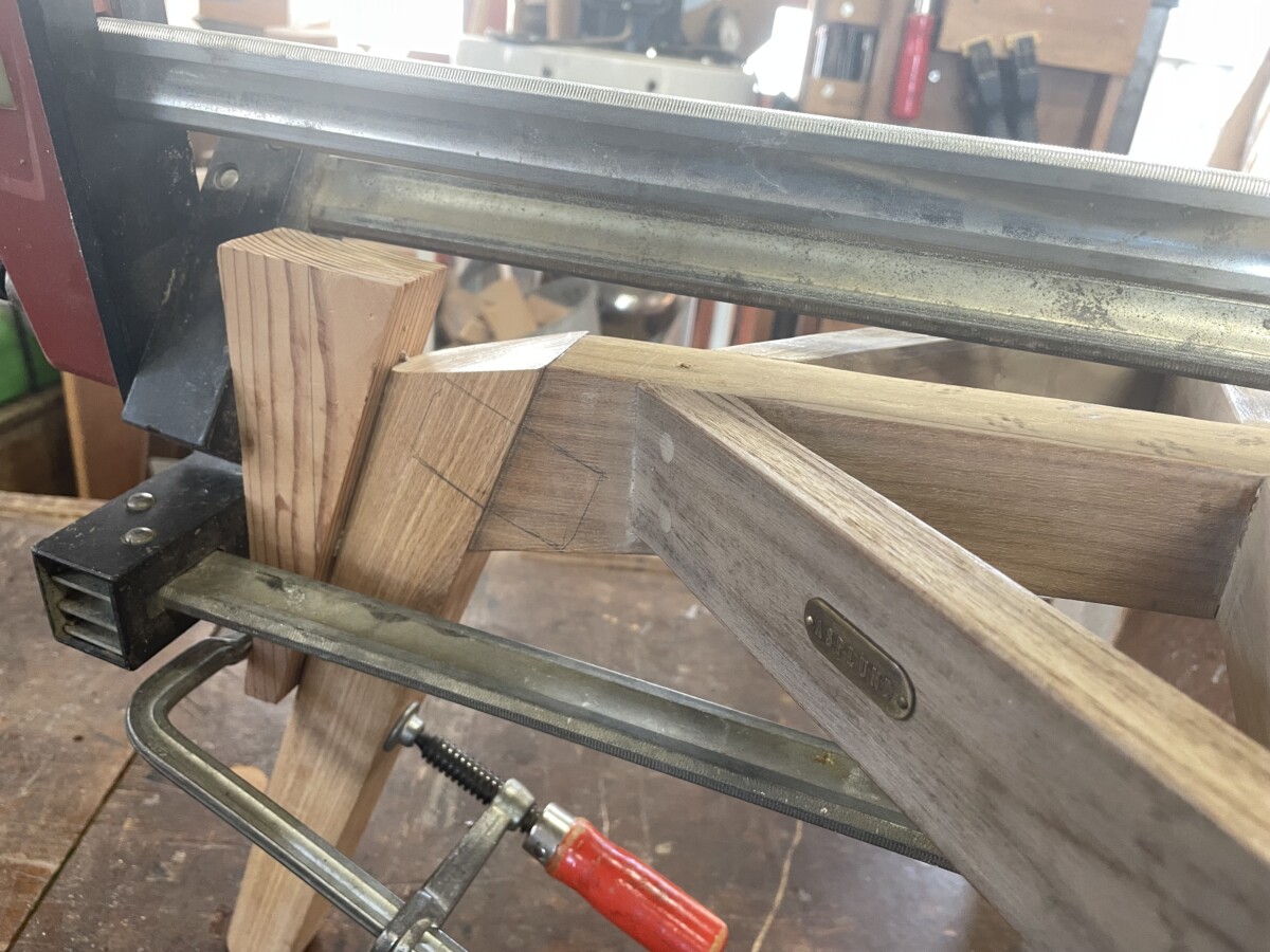 三角の当て木を入れて、クランプがしっかり面で当たるように調整します。