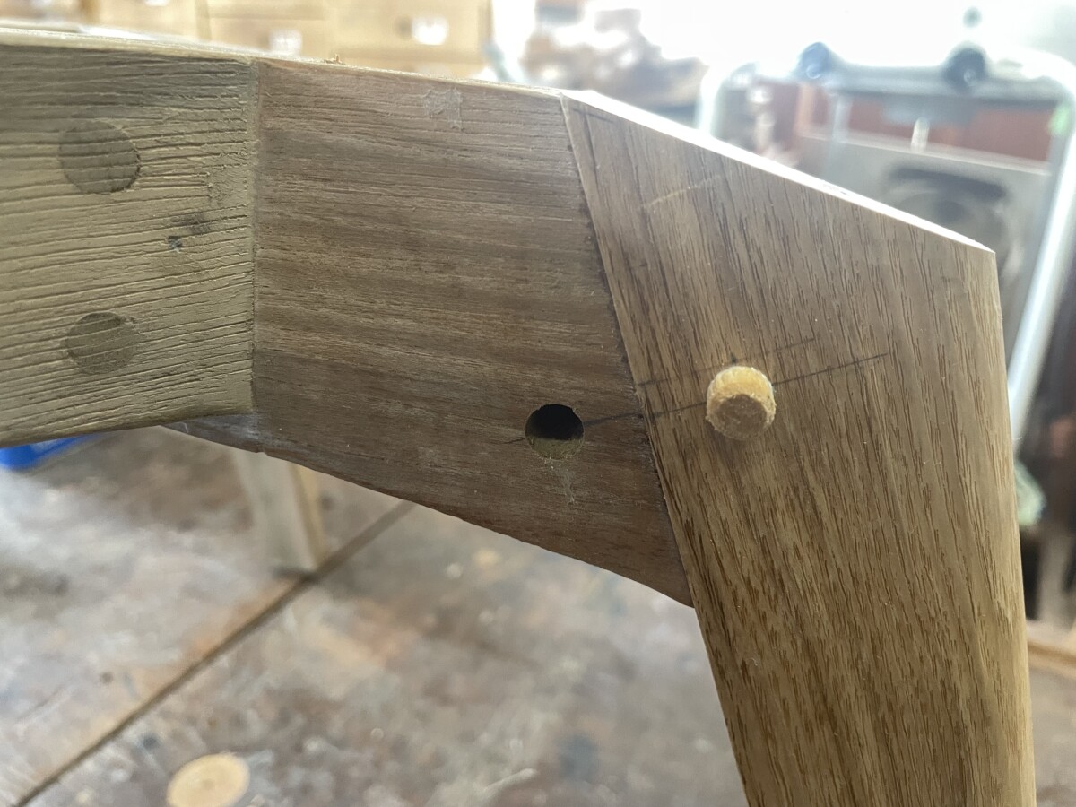 内部の枘を狙って外側から穴を開けダボを差し込みます。