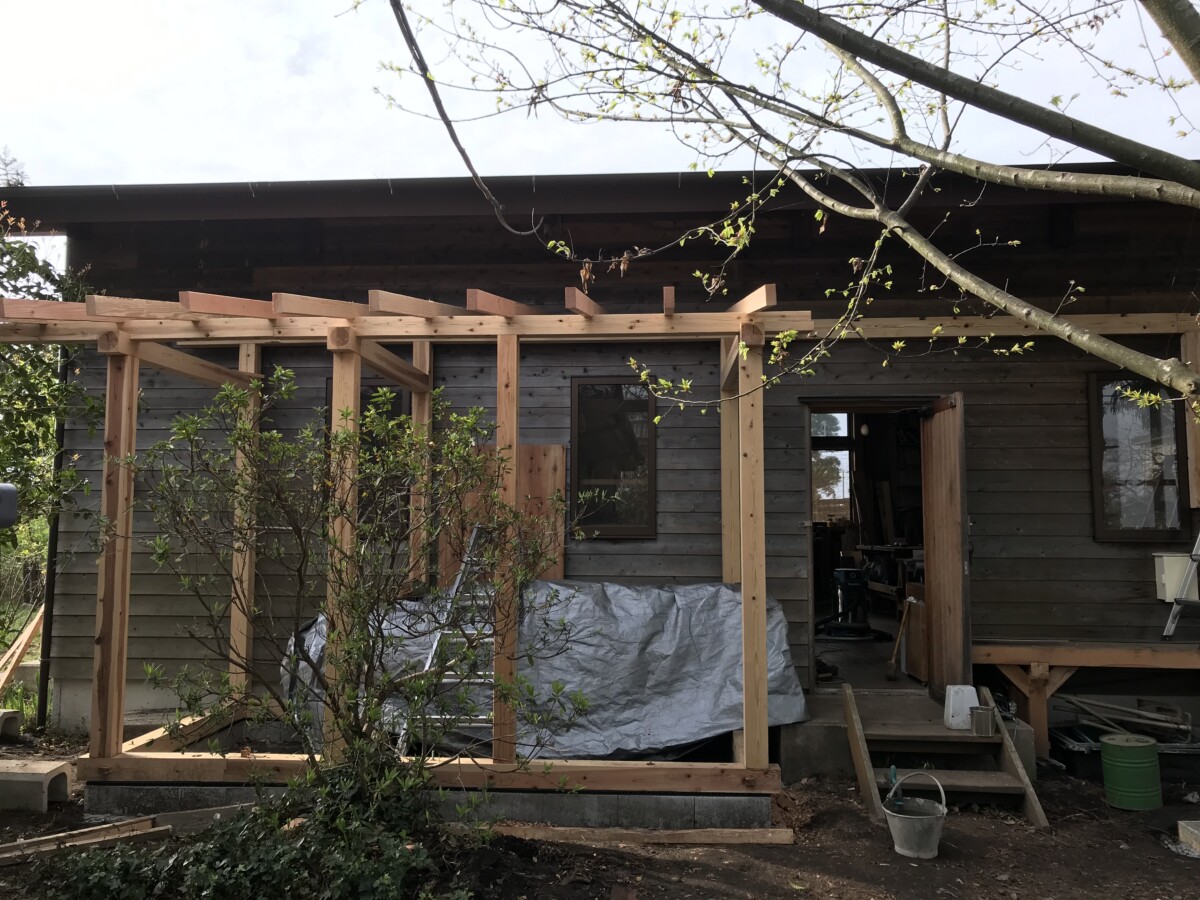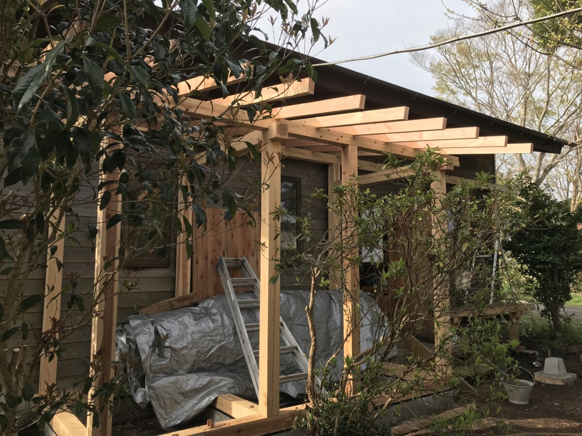 家内の陶芸の窯小屋です。やめておけば良いのに在来工法で建てています。重い柱で手を挟んだり小さな怪我もしながらなんとか建物の形になってきました。