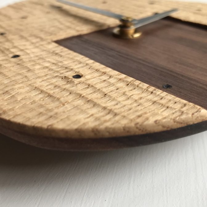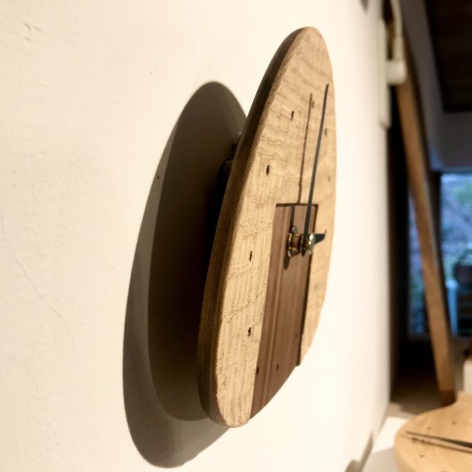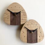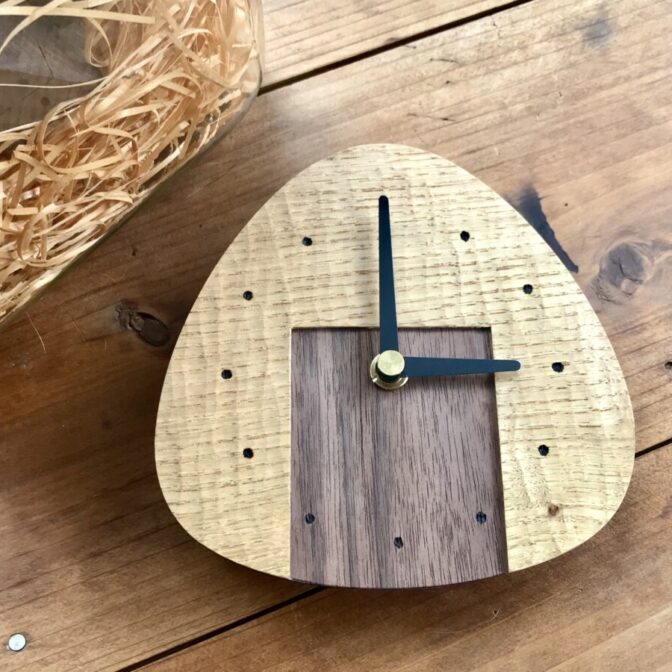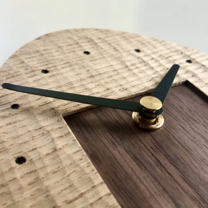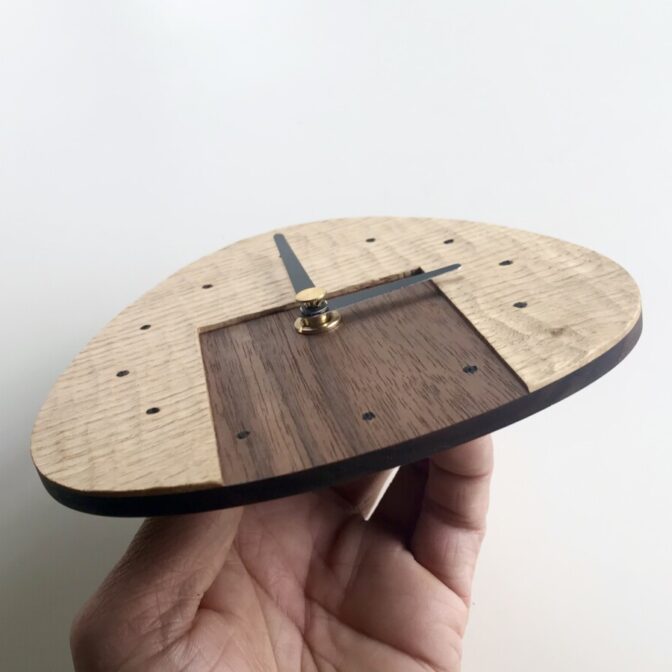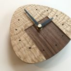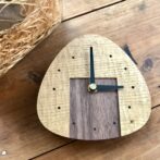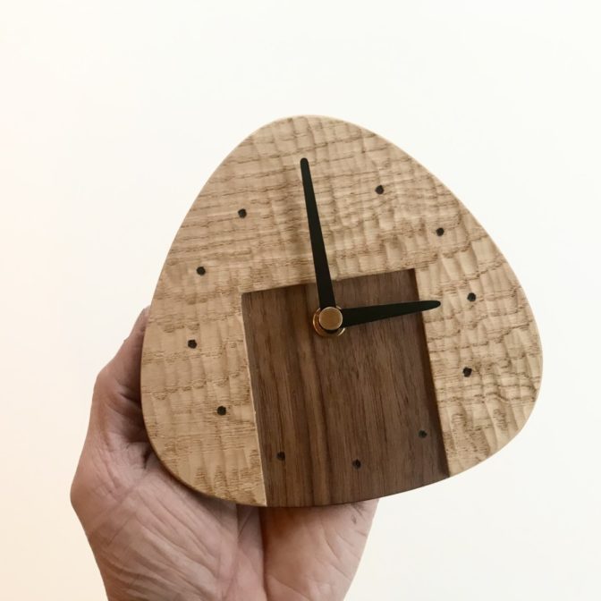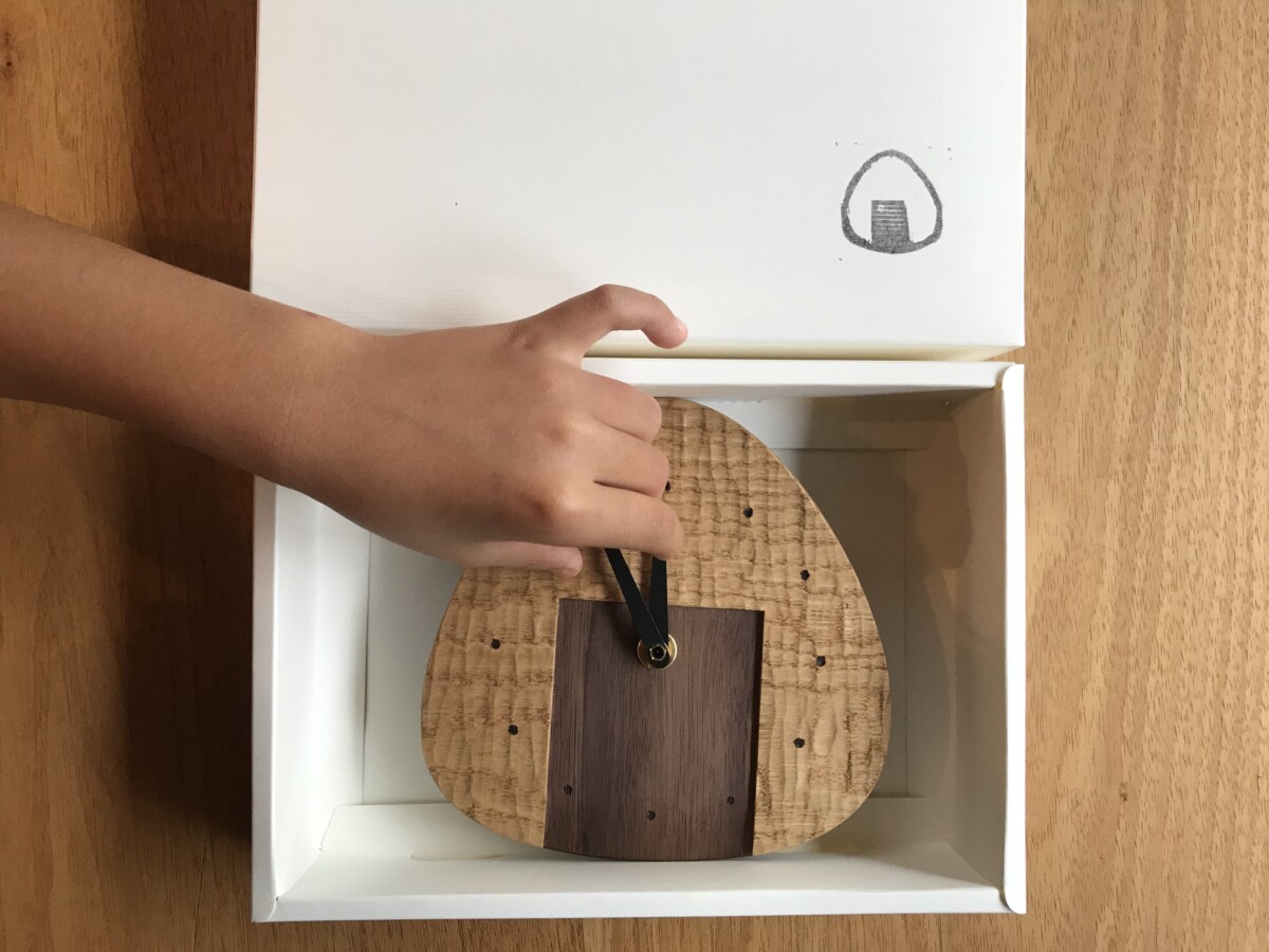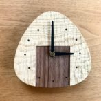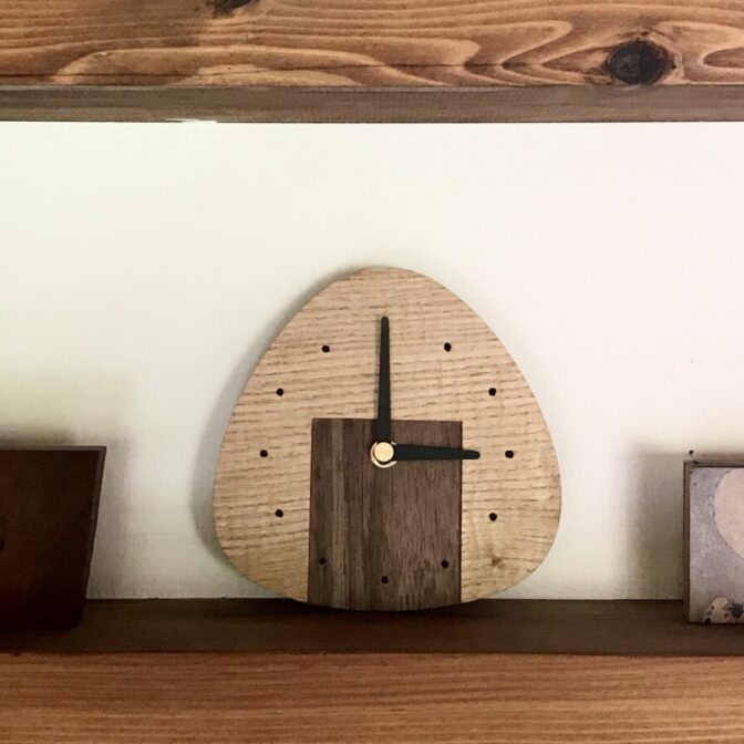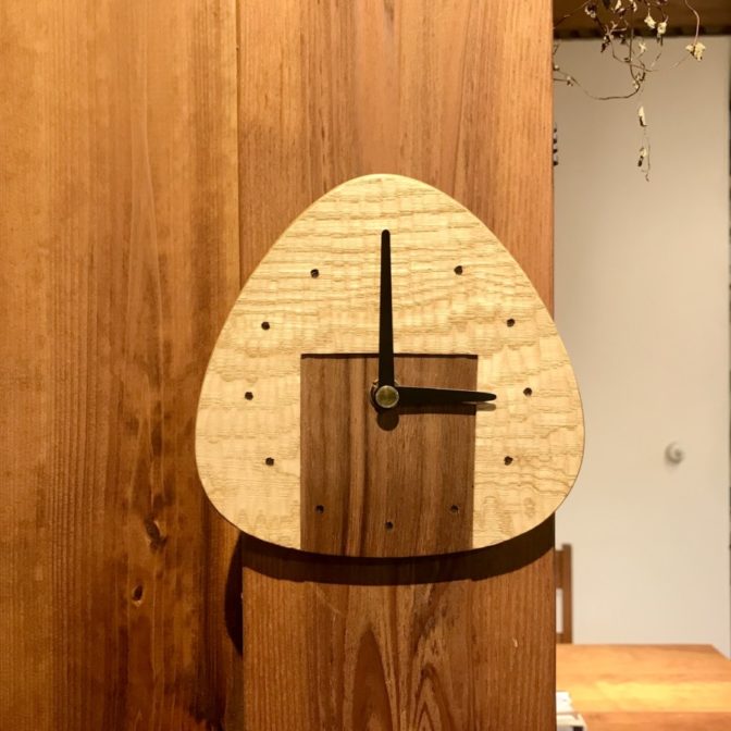 見ているだけでお腹が空いてしまいそうなおむすびの時計です。ブラックウォルナットとナチュラルな色味の木を貼り合わせて作った木製の壁掛け時計です。おうちで過ごす時間が少しでも楽しくなるようなデザインにしてみました。
