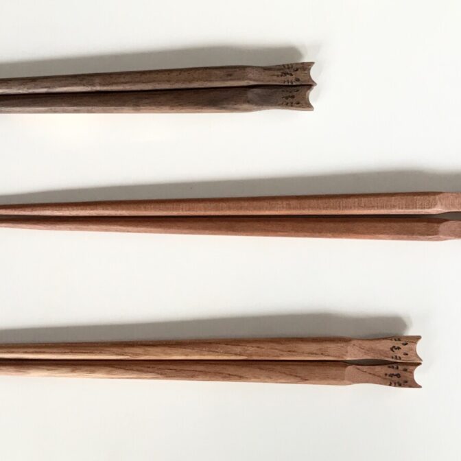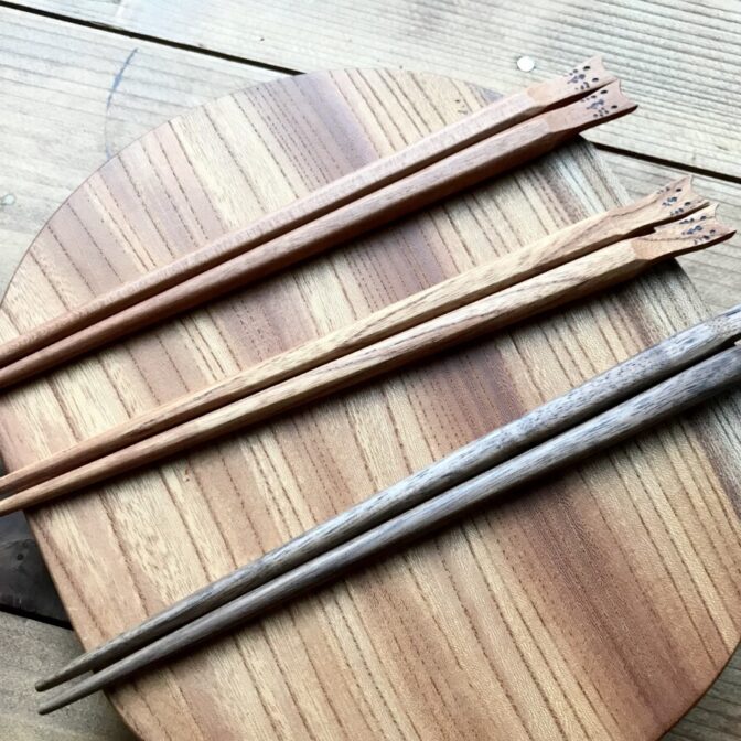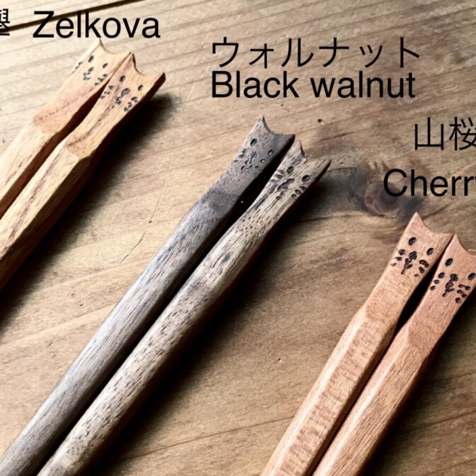 山桜、ブラックウォルナットの木を丁寧に彫って作ったお箸です。プレポリマー+クルミオイルで塗装しています。女性、子供用のサイズです。